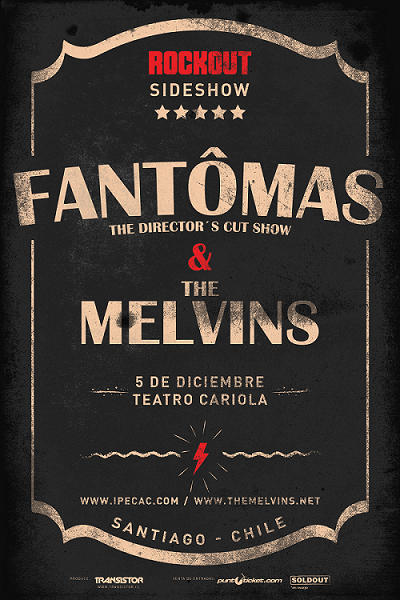 La presión de los fanáticos ya se hacia insostenible, finalmente y después de una ardua lucha se ha conseguido el tan anhelado SIDESHOW DE FANTOMAS Y MELVINS. Como ya teníamos antecedentes estas bandas se presentarían por primera vez en el festival ROCKOUT el día 06 de diciembre, pero sabio es el dicho: “Tanto va el cántaro al agua que al final se rompe” y es así como se logra que ambas bandas demenciales se encuentren juntas a pedido del publico enfervorecido que ya quiere ver a los secuaces de Patton (FANTOMAS) y de Buzz (MELVINS) en el que promete ser u evento inolvidable.