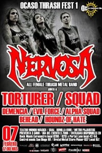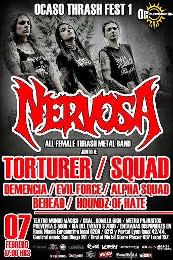Señores del metal, vayan preparando sus cuellos para cabecear con todo el Thrash de las brasileras de NERVOSA . El trío brasilero conformado por Fernanda Lira (voz y bajo), Pía Amaral (guitarra) y Pitchu Ferraz (batería) visitan por primera vez Chile para mostrar lo mejor del Thrash Metal Sudamericano con su disco “Victim of Yourself”. Junto a ellas , y no es para menos, las leyendas locales “TORTURER” y “SQUAD” les daremos la despedida antes de su gira europea en el “OBSCENE EXTREME FESTIVAL”.