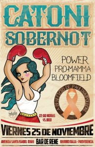 Este viernes 25 de noviembre en el clásico Bar de Rene las bandas Catoni y Sobernot se unen para reunir fondos para ir en ayuda de Paulina Polloni, Madre de 3 fieles seguidores del Rock, Camila, Alejandro y Daniel Bloomfield, que sufre de cáncer de riñón, para ayudarle a pagar su costoso tratamiento, por lo que todo lo recaudado ira en su directo beneficio.