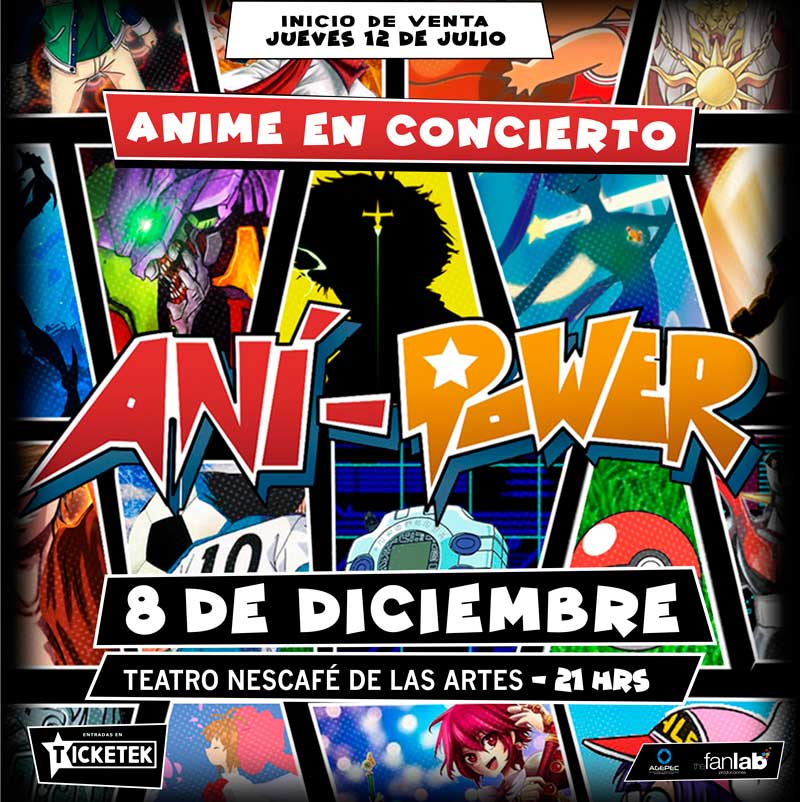 El 8 de diciembre a las 21.00 hrs, colisionará la música de: Dragon Ball, Los Caballeros del Zodíaco, Sailor Moon, Digimon, Cowboy Bebop, Mazinger Z, Pokemon, Sakura Card Captors, Evangelion, Las Guerreras Mágicas, Slayers, Meteoro, Robotech, Slam Dunk, Dr. Slump, Ranma 1/2, Shingeki No Kyojin, One Punch Man y muchos más de los mejores animé de la historia en un mega concierto audiovisual con luces y proyecciones denominado AniPower.