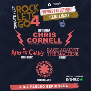 El sonido del rock alternativo de que marcó la década de los 90’s y principios el nuevo milenio se toma el Teatro Cariola, el próximo viernes 7 de octubre a partir de las 19 horas, y contará con la participación de: SEEYOURSELF con los clásicos de CHRIS CORNELL en su carrera como solista y sus bandas AUDIOSLAVE y SOUNDGARDEN; BROKENBONES, tributando a ALICE IN CHAINS; NOBODY, con los grandes éxitos de RAGE AGAINST THE MACHINE y ROLLERCOASTER con RED HOT CHILI PEPPERS.