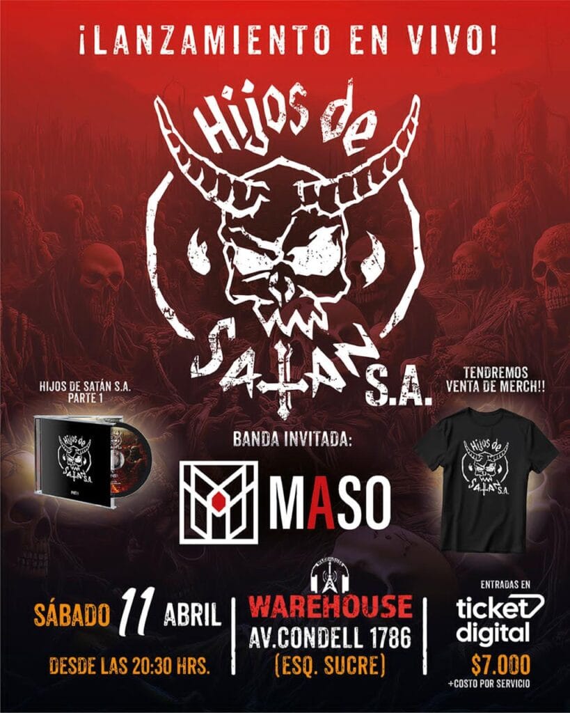 El próximo sábado 11 de abril a las 20:30 horas, Hijos de Satán S.A. realizará el lanzamiento oficial de su primer EP “Hijos de Satán S.A. Parte I” en Warehouse, ubicado en Condell 1786, esquina Sucre, en la comuna de Ñuñoa. La jornada se plantea como un hito para la banda, en un show en vivo que busca traducir toda la intensidad de su propuesta sonora y conceptual al escenario.